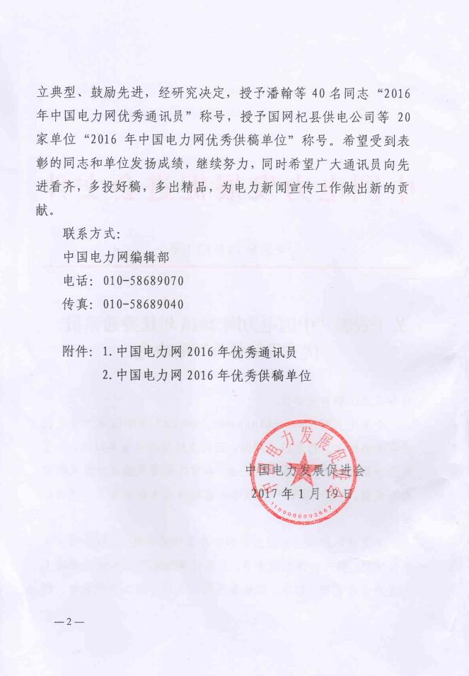 關(guān)于表彰“中國(guó)電力網(wǎng)2016年優(yōu)秀通訊員、優(yōu)秀供稿單位”的決定
