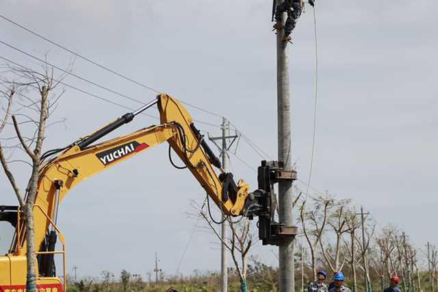 9月16日,在海南省文昌市鋪前鎮(zhèn)七嶺村七嶺2號臺區(qū)搶修復(fù)電現(xiàn)場,一臺身著“黃衣”、帶履帶的“龐然大物”,正揮動著靈活的機(jī)械臂,伸出它的“鉗子”,穩(wěn)穩(wěn)地抓取12米多長的電桿,一氣呵成把電桿種到桿洞中。當(dāng)天,只用了3個(gè)多小時(shí),它就完成了10基電桿的立桿作業(yè)任務(wù)。