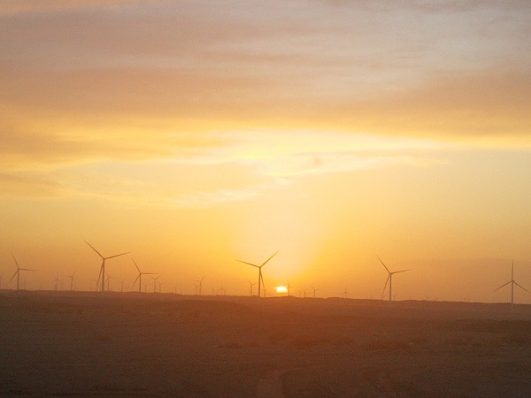 工作了一天,我們會在晚上看落日晚霞,戈壁灘上的落日很大,輪廓分明而清晰,隨著時間的推移,太陽慢慢的落進(jìn)了地平線里,此時的天空呈現(xiàn)出紅黃綠藍(lán)的漸變顏色,柔和而美麗,風(fēng)機的輪廓也映襯著更加的鮮明可見,放眼望去,只看見千百臺風(fēng)機在轉(zhuǎn)動,使人心曠神怡。