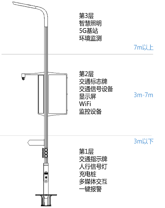 中電啟明星所開發(fā)的智慧路燈主要采用模塊化分層級的桿體設計,將路燈桿體分為頂部(>7米)、中部(3-7米)、下部(<3米)三個層次: