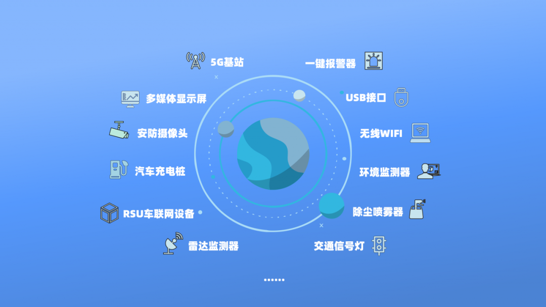 在不同高位層次里規(guī)劃部署相應的智能化設備,包括但不限于5G基站、多媒體顯示屏、安防攝像頭、交通信號燈、充電樁、一鍵呼叫等數(shù)十類設備。每一層次里的設備都可靈活更換、拆卸;桿體內匹配相應的電容器和智能斷路器,在配電側整合強弱電機柜,安裝智能門鎖、溫度監(jiān)測,實行低壓供電,分級控制,充分滿足個性化的場景應用需求。