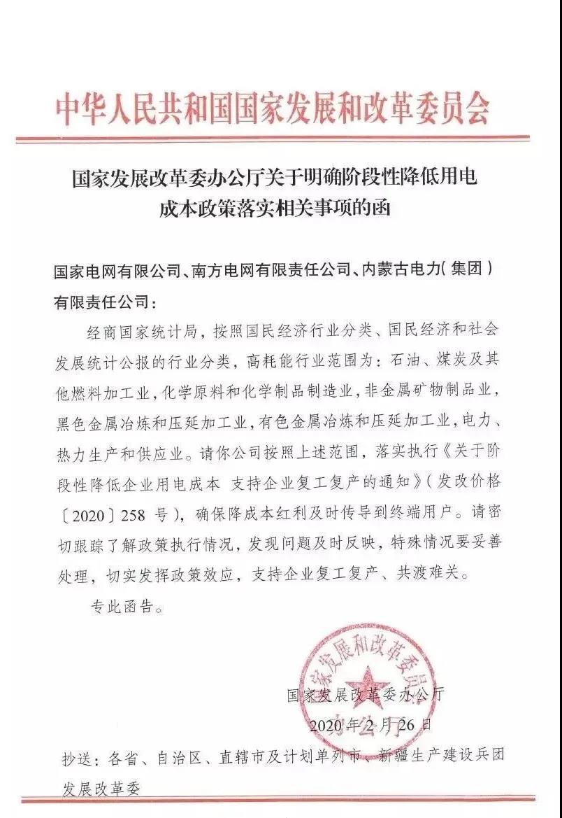 近日,國(guó)家發(fā)展改革委印發(fā)《關(guān)于明確階段性降低用電成本政策落實(shí)相關(guān)事項(xiàng)的函》,函件中進(jìn)一步明確高耗能行業(yè)范圍為:石油、煤炭及其他燃料加工業(yè),化學(xué)原料和化學(xué)制品制造業(yè),非金屬礦物制品業(yè),黑色金屬冶煉和壓延加工業(yè),有色金屬冶煉和壓延加工業(yè),電力、熱力生產(chǎn)和供應(yīng)業(yè)。除以上行業(yè)外的工業(yè)用戶(hù)及全部商業(yè)用戶(hù)可享受電價(jià)95折優(yōu)惠。