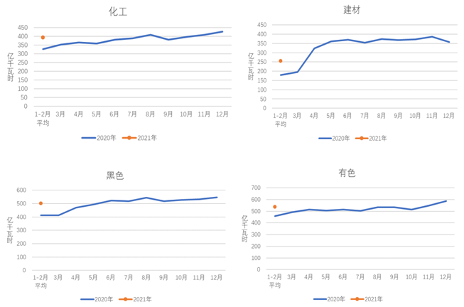圖4 2020、2021年重點(diǎn)行業(yè)分月用電量情況