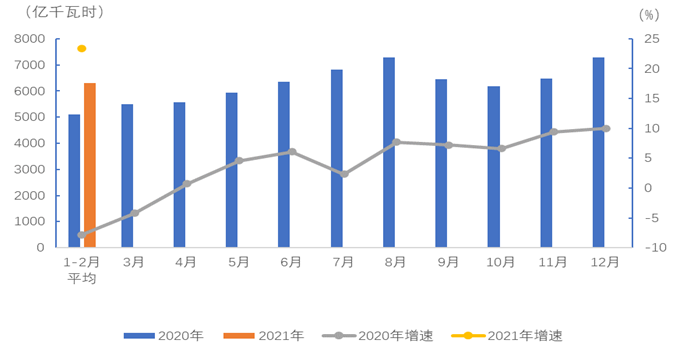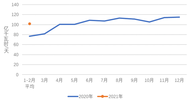 1-2月,全國全社會(huì)用電量12588億千瓦時(shí),同比增長22.2%。