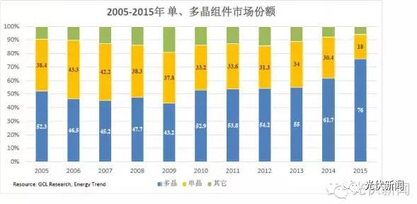 我們先來了解一些信息,圖一是05年到15年,單晶、多晶、薄膜等的市場(chǎng)份額變化,我們可以發(fā)現(xiàn),從09年到15年,單晶、薄膜等的市場(chǎng)份額是不斷降低的,而多晶則在15年實(shí)現(xiàn)了一個(gè)井噴。圖二是日本單晶市場(chǎng)份額的統(tǒng)計(jì)數(shù)據(jù),日本是一個(gè)國(guó)土面積十分有限的國(guó)家,對(duì)高效組件的需求應(yīng)該超過其他國(guó)家,可是
