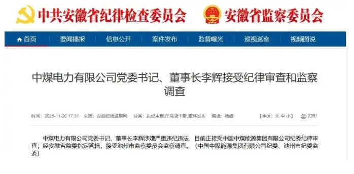 據安徽紀檢監(jiān)察網11月26日消息,中煤電力有限公司黨委書記、董事長李輝涉嫌嚴重違紀違法,目前正接受中國中煤能源集團有限公司紀委紀律審查;經安徽省監(jiān)委指定管轄,接受池州市監(jiān)察委員會監(jiān)察調查。