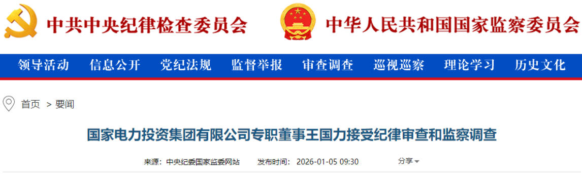 國(guó)家電力投資集團(tuán)有限公司專職董事王國(guó)力接受紀(jì)律審查和監(jiān)察調(diào)查