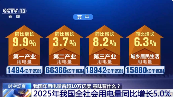 超10萬億度的年用電量,也考驗(yàn)著一個(gè)國(guó)家電力系統(tǒng)的供給能力與韌性。2025年,我國(guó)通過構(gòu)建清潔低碳的發(fā)電體系、打造高效互聯(lián)的輸電網(wǎng)絡(luò)、完善靈活智能的調(diào)度機(jī)制,實(shí)現(xiàn)了電力的穩(wěn)定可靠供給。10萬億度電究竟用在了哪里?
