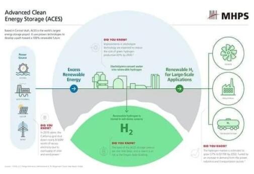 MHPS還通過(guò)猶他州高級(jí)清潔能源存儲(chǔ)(ACES)項(xiàng)目,開(kāi)發(fā)了網(wǎng)格化大規(guī)模的可再生氫生產(chǎn)和存儲(chǔ)技術(shù)。ACES項(xiàng)目使用可再生能源通過(guò)電解生產(chǎn)氫氣。氫氣將在現(xiàn)場(chǎng)的地下鹽穴實(shí)現(xiàn)跨季節(jié)存儲(chǔ),并供給墨西哥灣沿岸的煉油廠(chǎng)。當(dāng)風(fēng)、光可再生能源發(fā)電受限時(shí),存儲(chǔ)的可再生氫可以直接發(fā)電。
