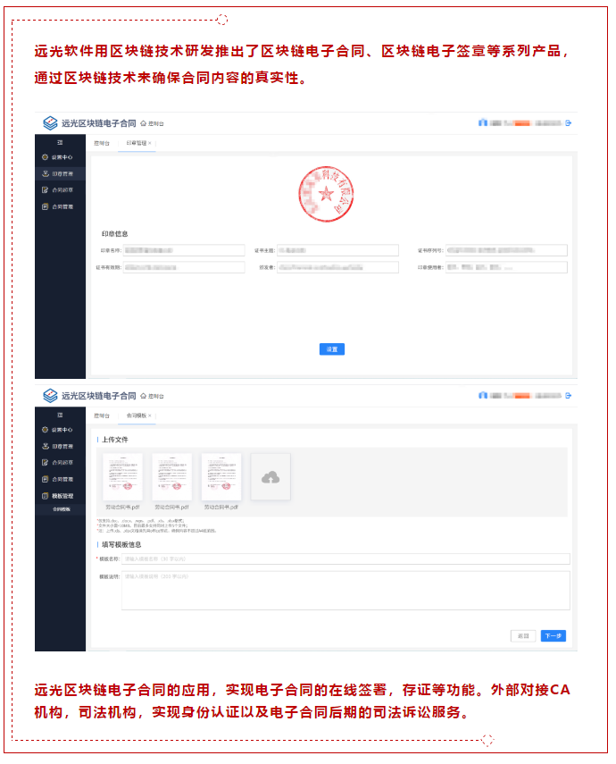 遠(yuǎn)光軟件用區(qū)塊鏈技術(shù)研發(fā)推出了區(qū)塊鏈電子合同、區(qū)塊鏈電子簽章等系列產(chǎn)品,通過(guò)區(qū)塊鏈技術(shù)來(lái)確保合同內(nèi)容的真實(shí)性。