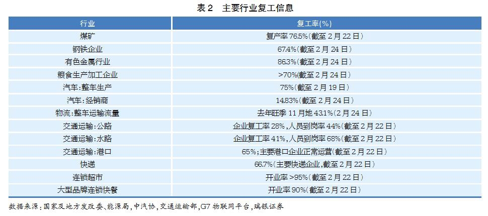 新冠疫情暴發(fā)以來(lái),為防止疫情擴(kuò)散,除去武漢等13個(gè)城市封城以外,大多數(shù)省份選擇延遲復(fù)工復(fù)產(chǎn)、嚴(yán)格實(shí)施出行管控。雖然自2月以來(lái),國(guó)內(nèi)政策重心已由防控疫情逐漸向企業(yè)復(fù)工傾斜,各地區(qū)開始分層分級(jí)推動(dòng)有序復(fù)工,但復(fù)工效率不及預(yù)期。由于地方隔離措施無(wú)法統(tǒng)一,返工人員明顯不足、交通物流依然不暢、產(chǎn)業(yè)鏈上下游尚未匹配、口罩等防疫物資持續(xù)不足,因此地區(qū)公布的企業(yè)復(fù)工數(shù)據(jù)僅代表企業(yè)獲得復(fù)工許可,產(chǎn)能實(shí)質(zhì)上未得到充分利用,“復(fù)工難復(fù)產(chǎn)”問題依然嚴(yán)峻。真正的全面復(fù)工可能需要到3月中下旬甚至更晚,而服務(wù)業(yè)的復(fù)工進(jìn)度更慢(注1)(見表1)。