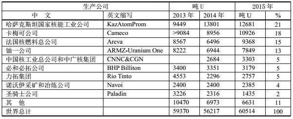 2013~2015年世界鈾生產(chǎn)主要公司