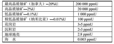 鈾在土壤、巖石及河流、海洋都可發(fā)現(xiàn);甚至在人體和食品中都有痕跡量存在。但是濃縮的鈾礦卻只在很少的地方發(fā)現(xiàn),一般是在堅硬的巖石中,如在地殼中占60%的花崗巖中,其鈾含量可達(dá)百萬分之四。