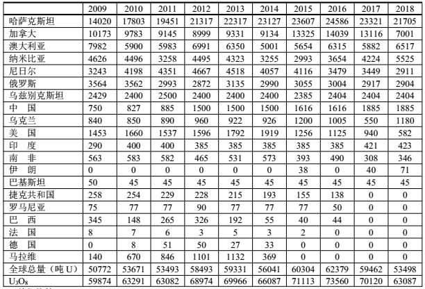 2009-2018期間各國鈾產(chǎn)量